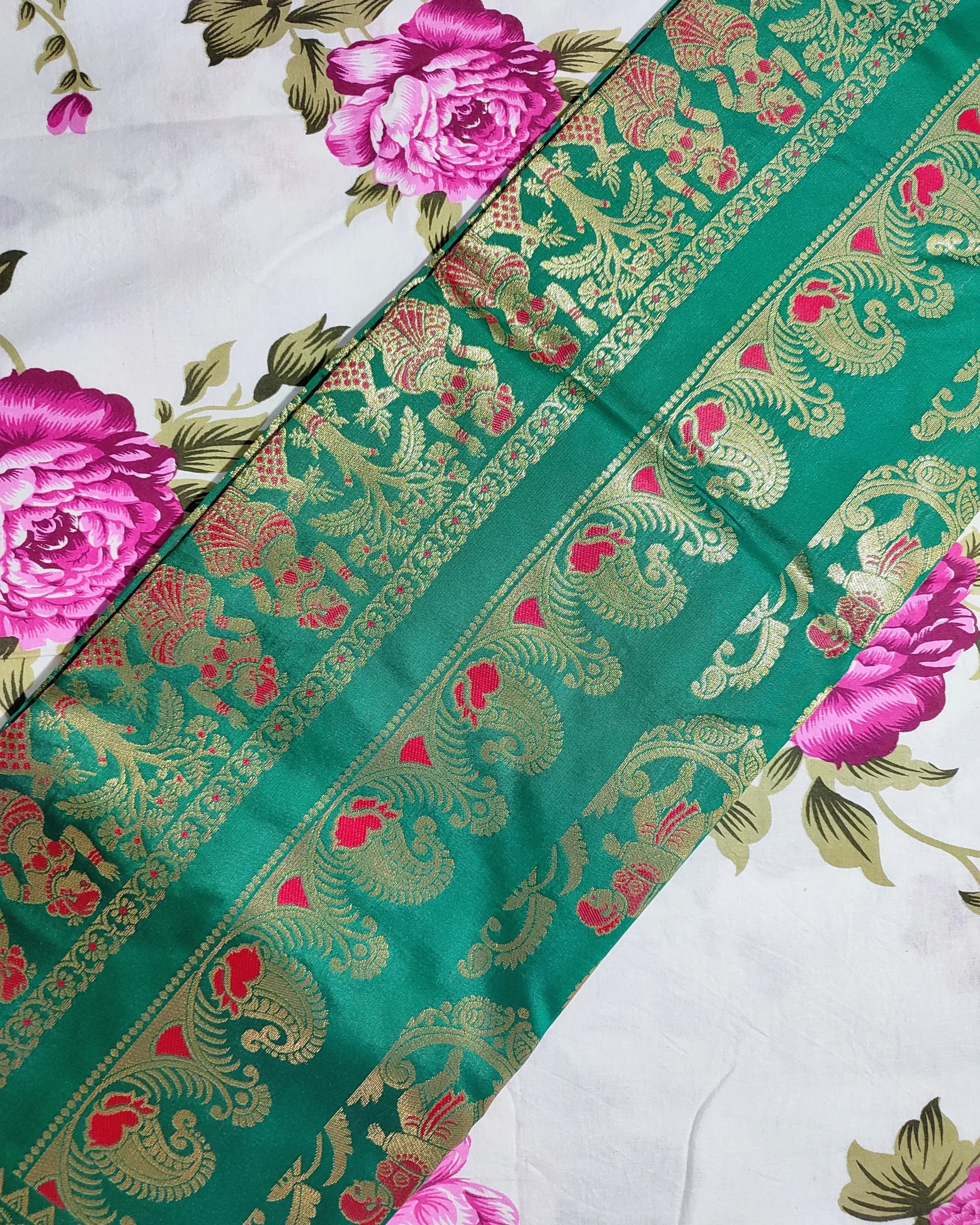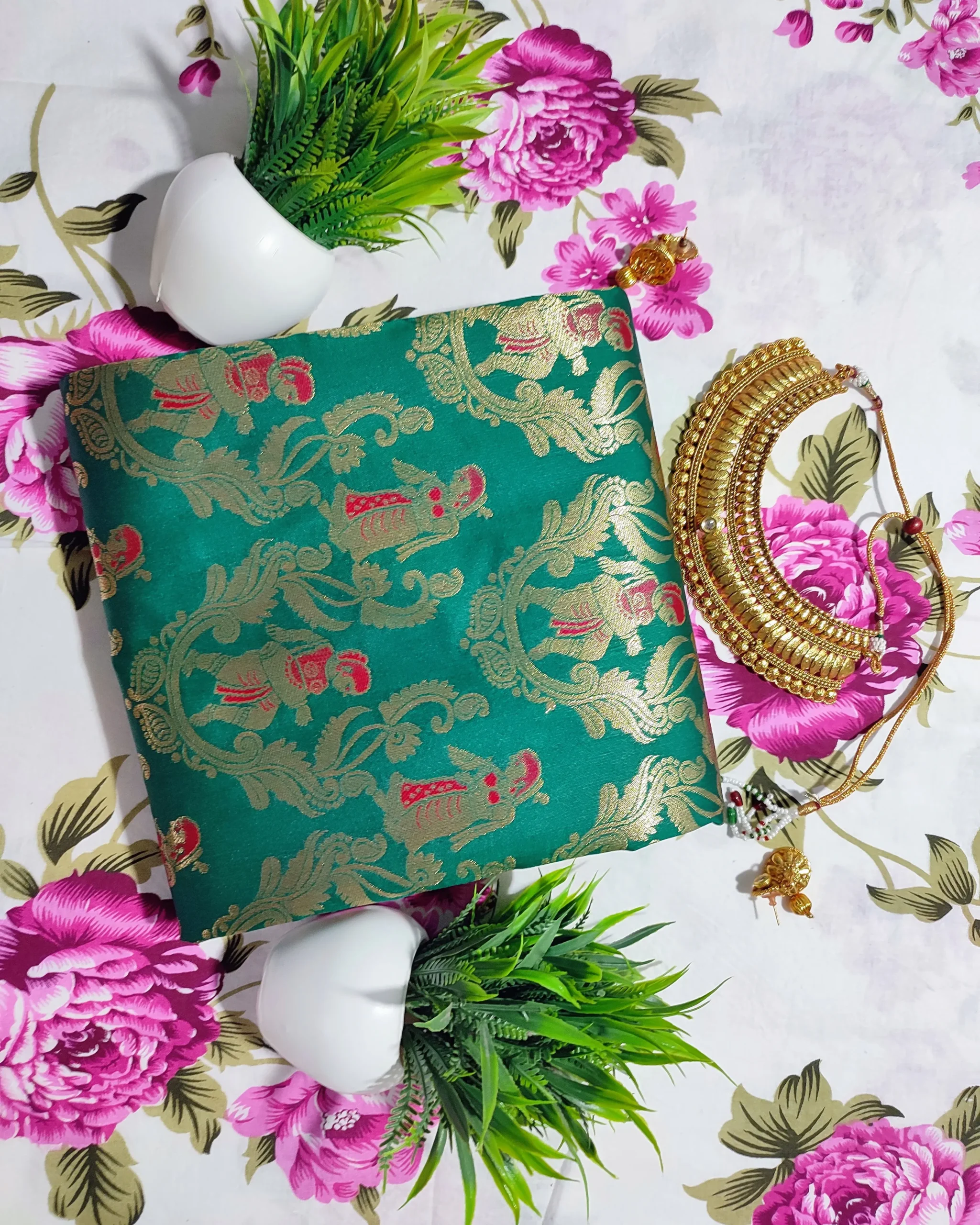 Immerse yourself in timeless elegance with this exquisite emerald green saree, a masterpiece of traditional silk saree. The rich silk fabric showcases intricate golden zari work depicting classic motifs and elaborate border designs. The saree features stunning panel work with detailed storytelling scenes woven into its architecture, creating a mesmerising visual narrative. The sophisticated colour palette of deep green with metallic gold accents makes it perfect for special occasions and festivities. The matching blouse piece complements the saree’s grandeur, while the luxurious drape ensures comfort throughout wear. The ornate border and pallu showcase meticulous attention to detail with traditional patterns that celebrate India’s rich textile heritage. This saree is ideal for weddings, formal gatherings, and cultural celebrations where you wish to make a striking impression. Pair with traditional jewellery to complete this regal ensemble. Dry clean recommended to maintain the saree’s pristine condition.